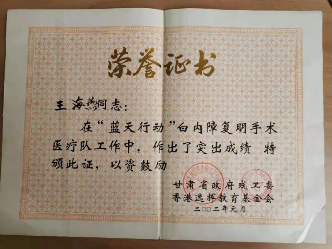 從醫(yī)以來,王海燕院長不僅精勤醫(yī)術(shù),更是潛心公益。1998年開始,國家大力推進防盲治盲工作,作為蘭大一院的骨干力量,她多次被省殘聯(lián)選中隨“藍天行動”、“光明行動”、“彭年光明行動”醫(yī)療隊,赴青海、甘南、臨夏等偏遠地區(qū),為白內(nèi)障患者實施復明手術(shù);2002年,由于在“藍天行動”中成績突出,受到甘肅省政府殘工委和香港逸揮教育基金會的表彰。
